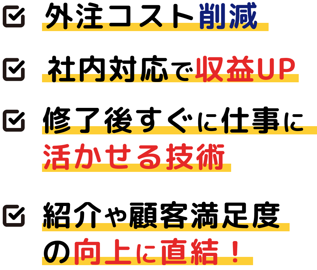 - 受講後、一定の技術水準を満たし、当社の方針にご賛同頂ける方は協力業者様としてお仕事の発注も可能です。